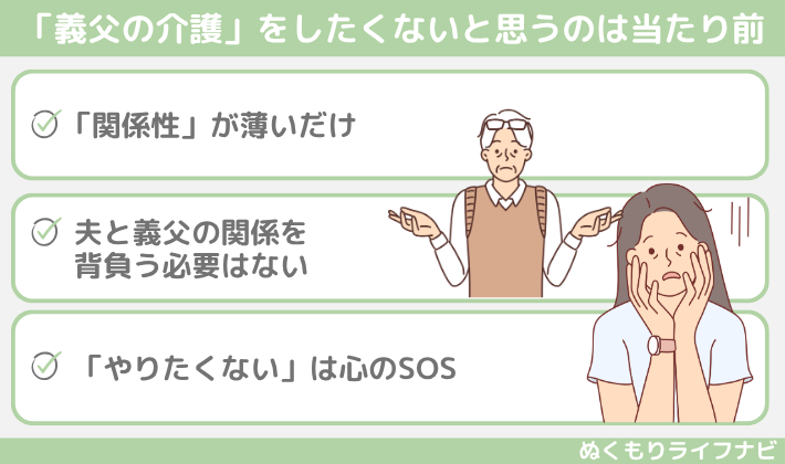 「義父の介護をしたくない」と思ったとき、多くの女性は「私って冷たい嫁なのかな」と自分を責めてしまいます。