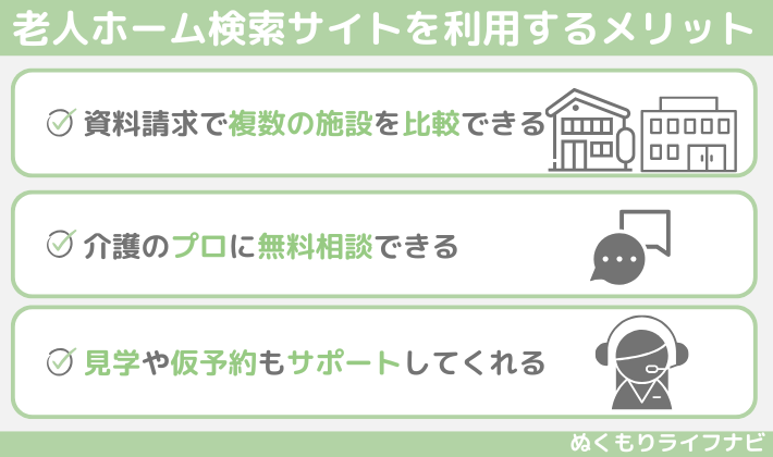 老人ホーム検索サイトを利用するメリットは以下の3つです。